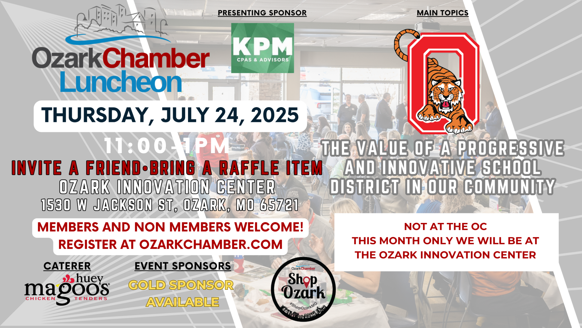 Ozark Chamber Luncheon is the chamber's monthly luncheon designed for network development. Gather with approximately 100 chamber members to promote your business and stay informed on community information or engage in professional development. Program is held at the OC (Ozark Community Center) at 1530 W. Jackson St., Ozark, MO. The event is held on the fourth Thursday of each month.