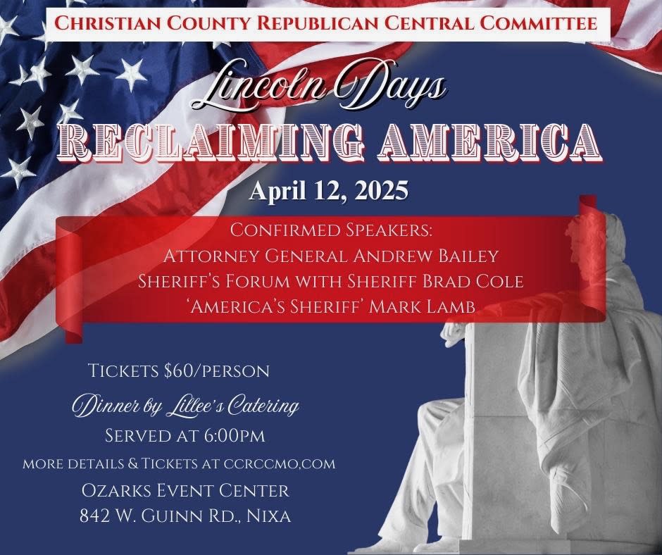 CCRCC annual Lincoln Day will be held Saturday, April 12th. Our speakers are Sheriff Mark Lamb from AZ, MO Attorney General Andrew Bailey, and a sheriff's forum to be held by our own Christian County Sheriff Brad Cole. Tickets are $60 in advance (tickets are not available at the door). **SPECIAL ADVERTISING IS AVAILABLE FOR THE PROGRAMS. BUSINESSES CAN ALSO BUY A TABLE AND RECEIVE PRIORITIZED SEATING & ADVERTISING. (Contact Sandy @ 816-507-0600 or ccrccevents@gmail.com for more information)