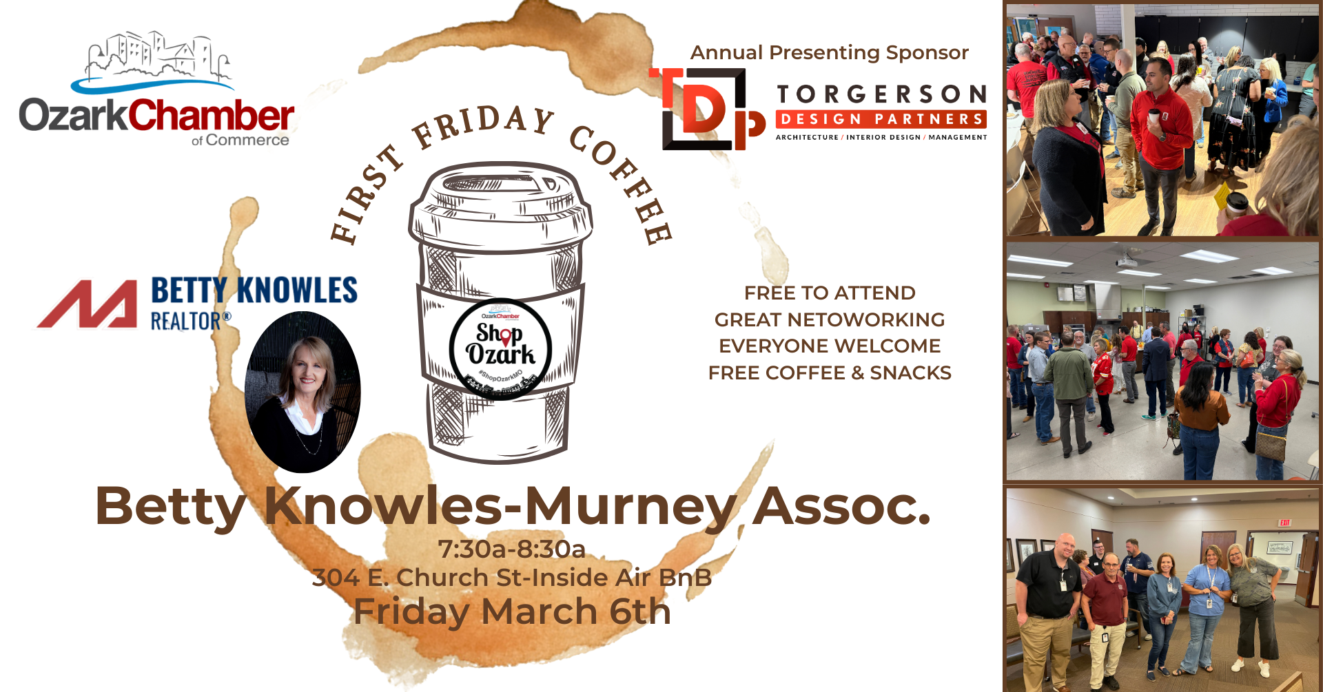 Join us for a casual and energizing morning of networking at our monthly First Friday Coffee, This event highlights a different Chamber member each month while offering a laid-back atmosphere to build relationships and connect with others in the Ozark business community.
