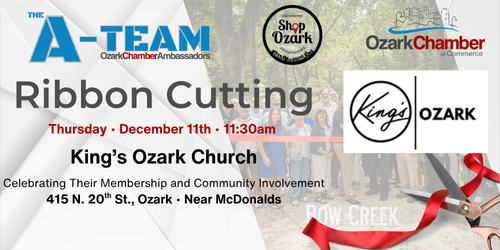 Join us December 11th at 11:30 AM as we celebrate a new member of the Ozark Chamber family with a ribbon cutting at King’s Ozark Church, located at 451 N 20th Street in Ozark. King's Ozark King’s Ozark is all about “People, Power, Purpose” and helping people experience life through worship, teaching, and community connection. King's Ozark Come help us welcome them to the Chamber, take a tour, meet the leadership team, and learn more about their ministries, life groups, and ways they serve our community. We would love to see our Chamber members, neighbors, and friends come out and show them some Ozark support.