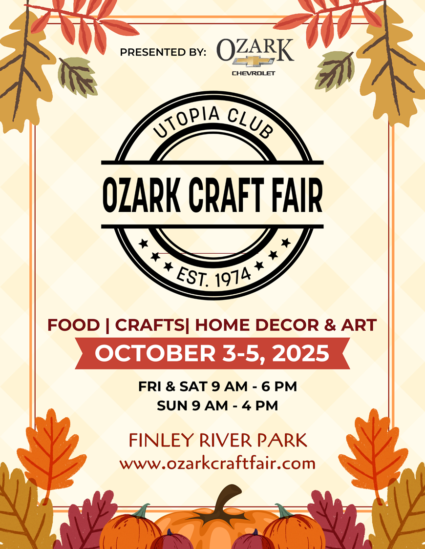 The annual Ozark Craft Fair, hosted by the GFWC Utopia Club of Ozark at Finley River Park in Ozark, MO. For 2025, the fair is scheduled for October 3rd–5th, featuring over 350 vendors selling handcrafted goods, food, and more. The free event has a long-standing tradition of supporting the Ozark community, with proceeds benefiting local charities and programs.