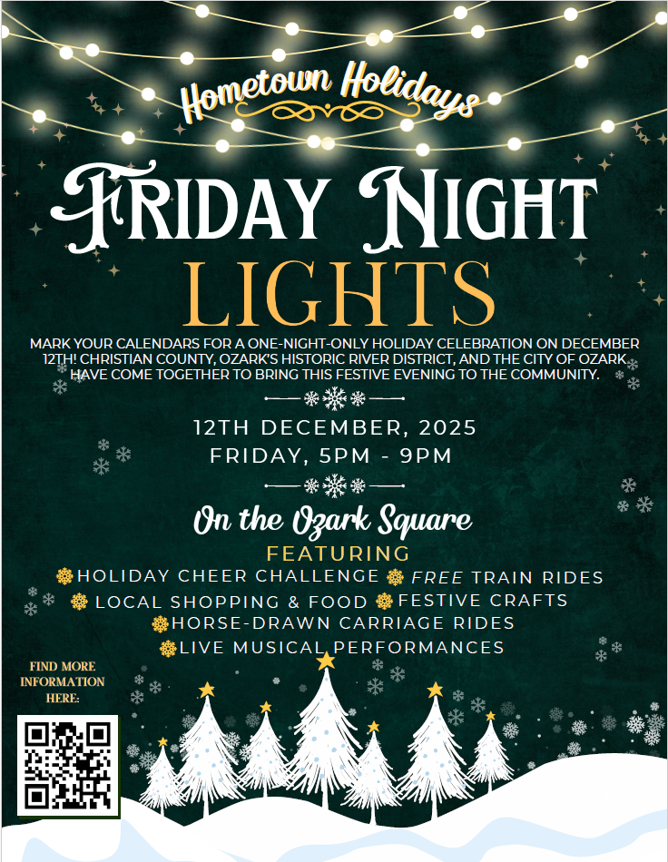 The Offices of Christian County, Ozark’s Historic River District, and the City of Ozark are joining together to bring a magical evening of holiday cheer to our community!
