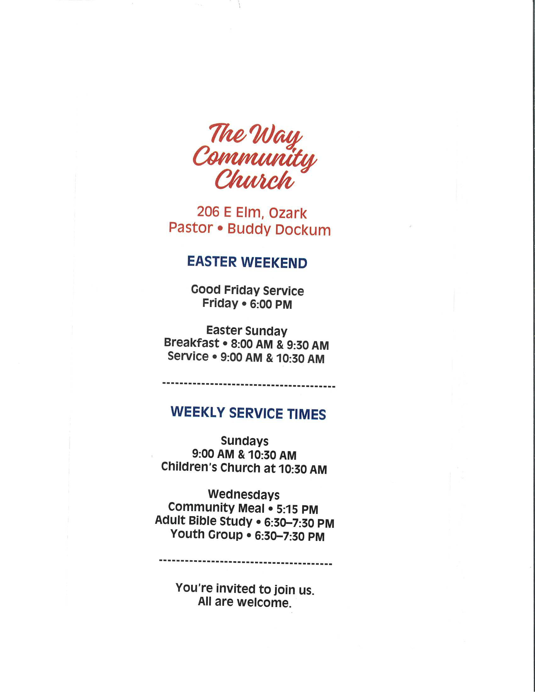 The Way Community Church will be holding a Good Friday Service, Easter Sunday Breakfast and Easter Sunday Services